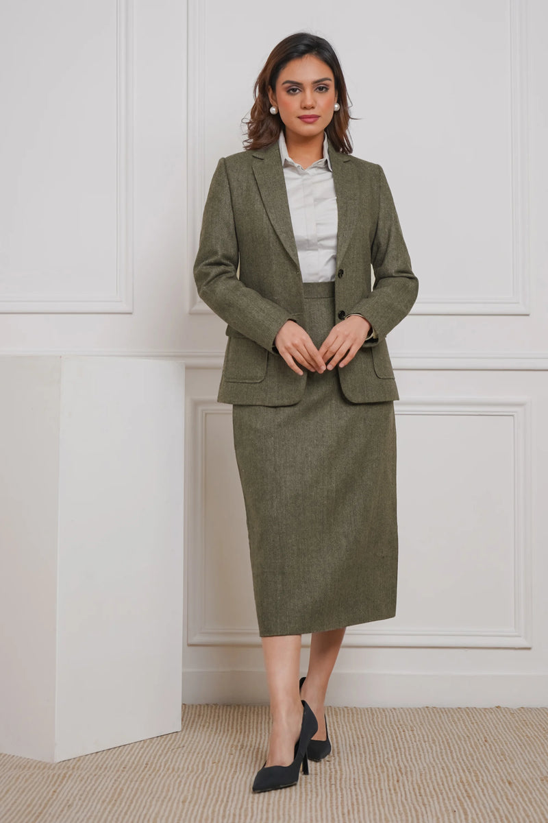Power Play in Herringbone Olive Green Blazer with Skirt Set