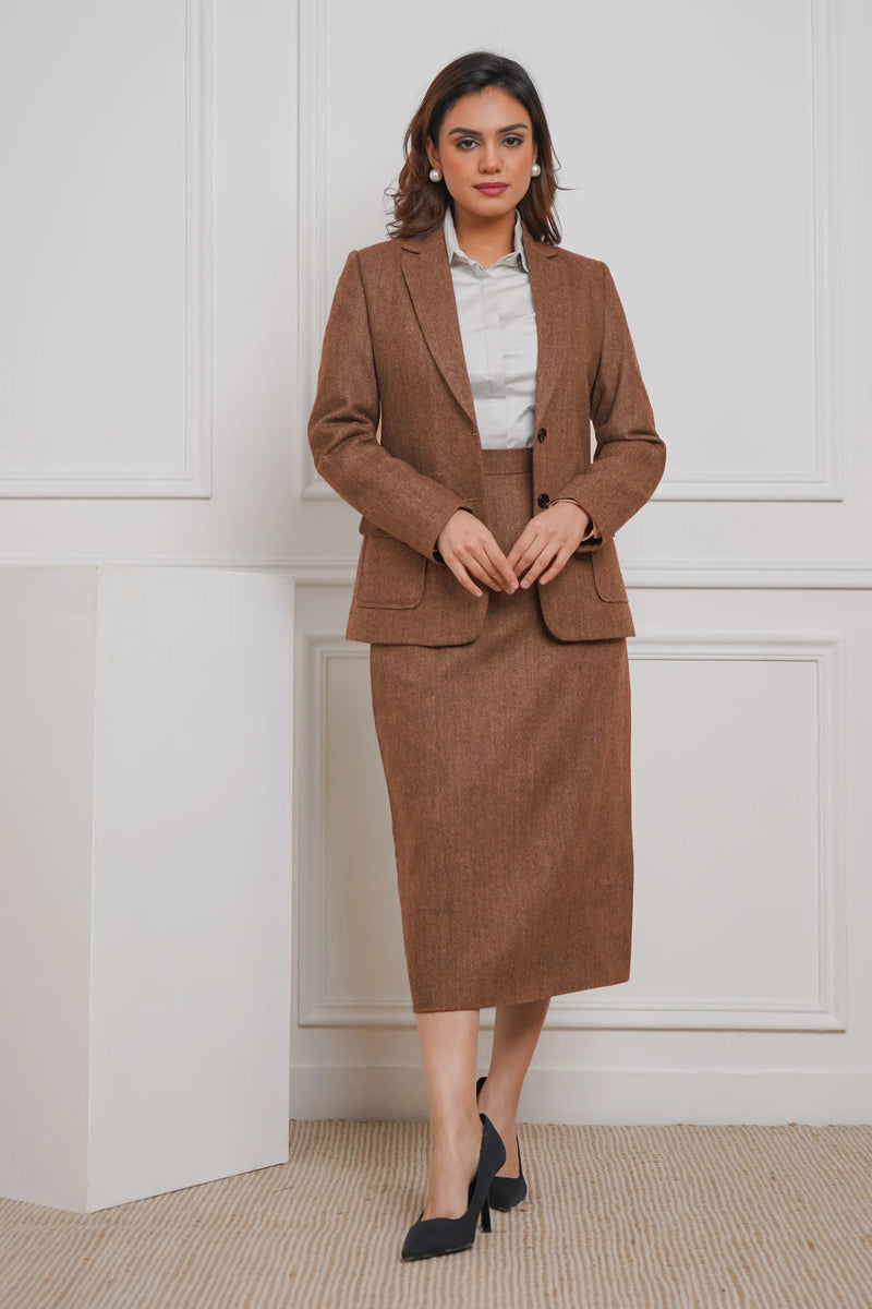 Power Play in Herringbone Tan-tastic Blazer with Skirt Set