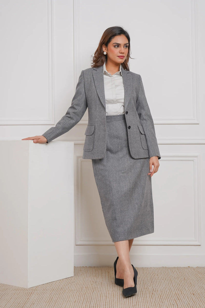 Power Play in Herringbone Gray Blazer with Skirt Set