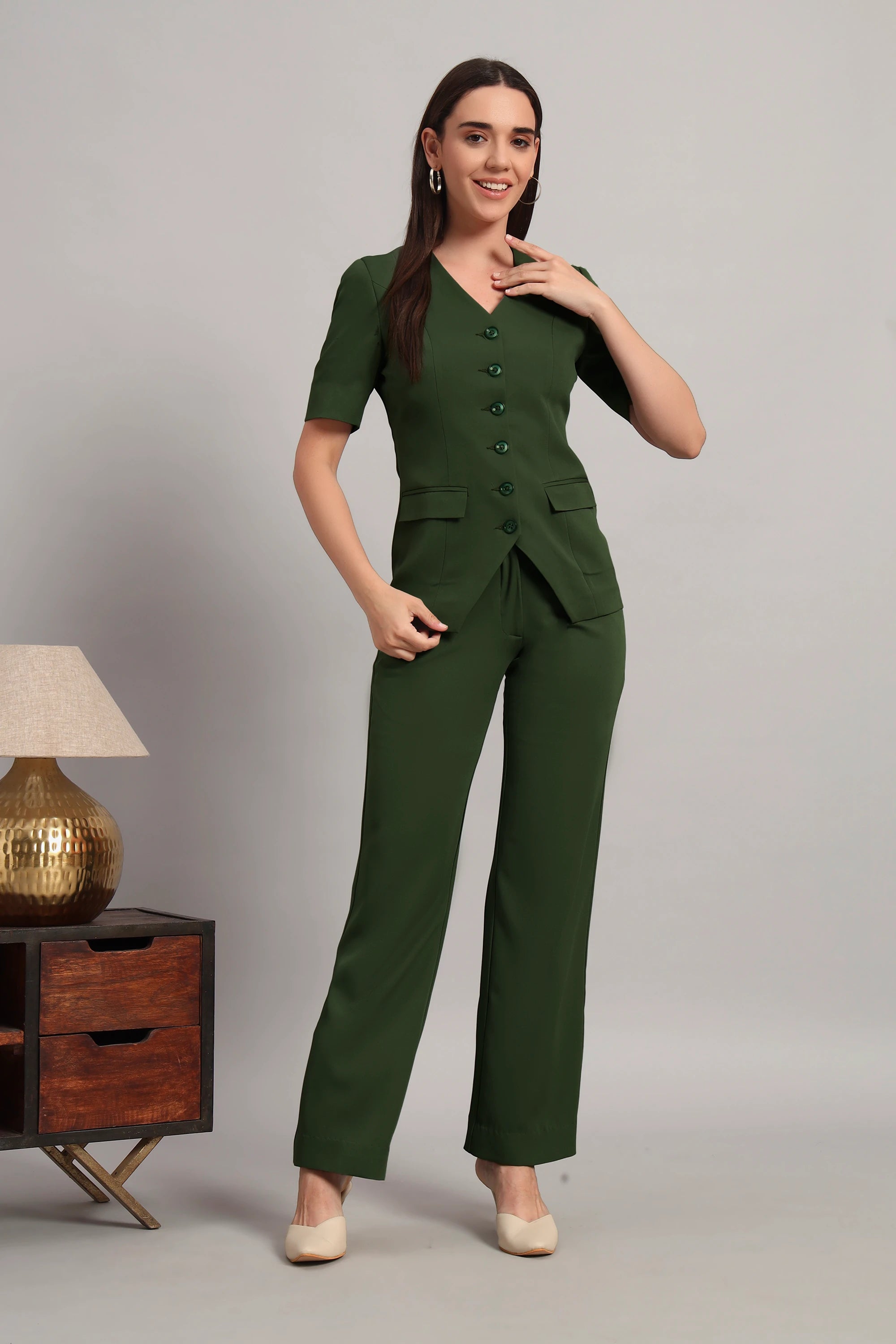 Own the summer in this effortlessly cool co-ord set! The half-sleeve V-neck blazer with princess cuts keeps it polished yet breathable, while the mid-rise straight-fit trousers offer all-day ease. Made from lightweight, stretch crepe and designed for movement, it’s your go-to for beating the heat in style—whether at work or out for lunch.