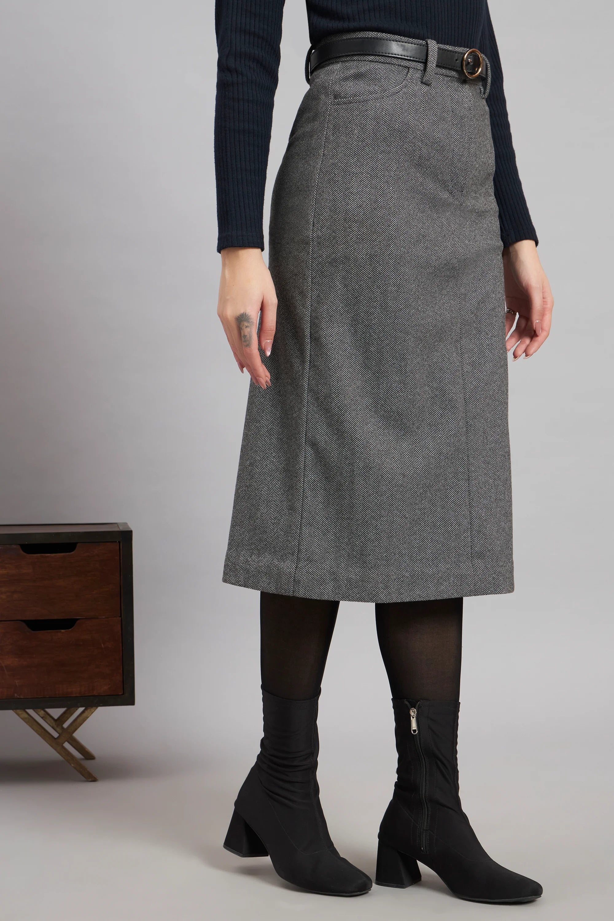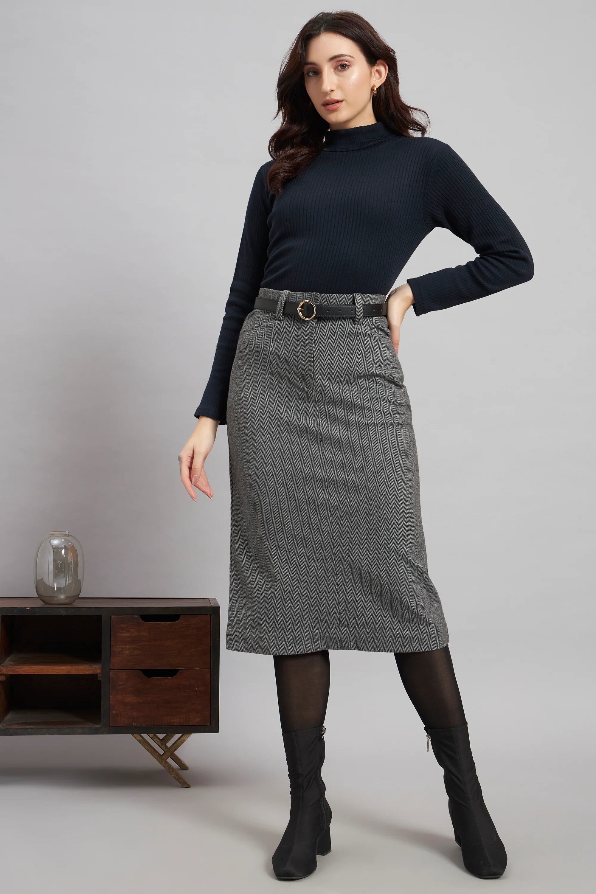 Step into refined winter elegance with this Grey Herringbone Wool Skirt, designed to flatter and move with you. The high-rise, straight silhouette in stretchable wool offers structure without stiffness, while belt loops, front pockets, and a centre back slit add both function and finesse. Perfectly balanced in weight, it’s ideal for long workdays and after-hours polish.