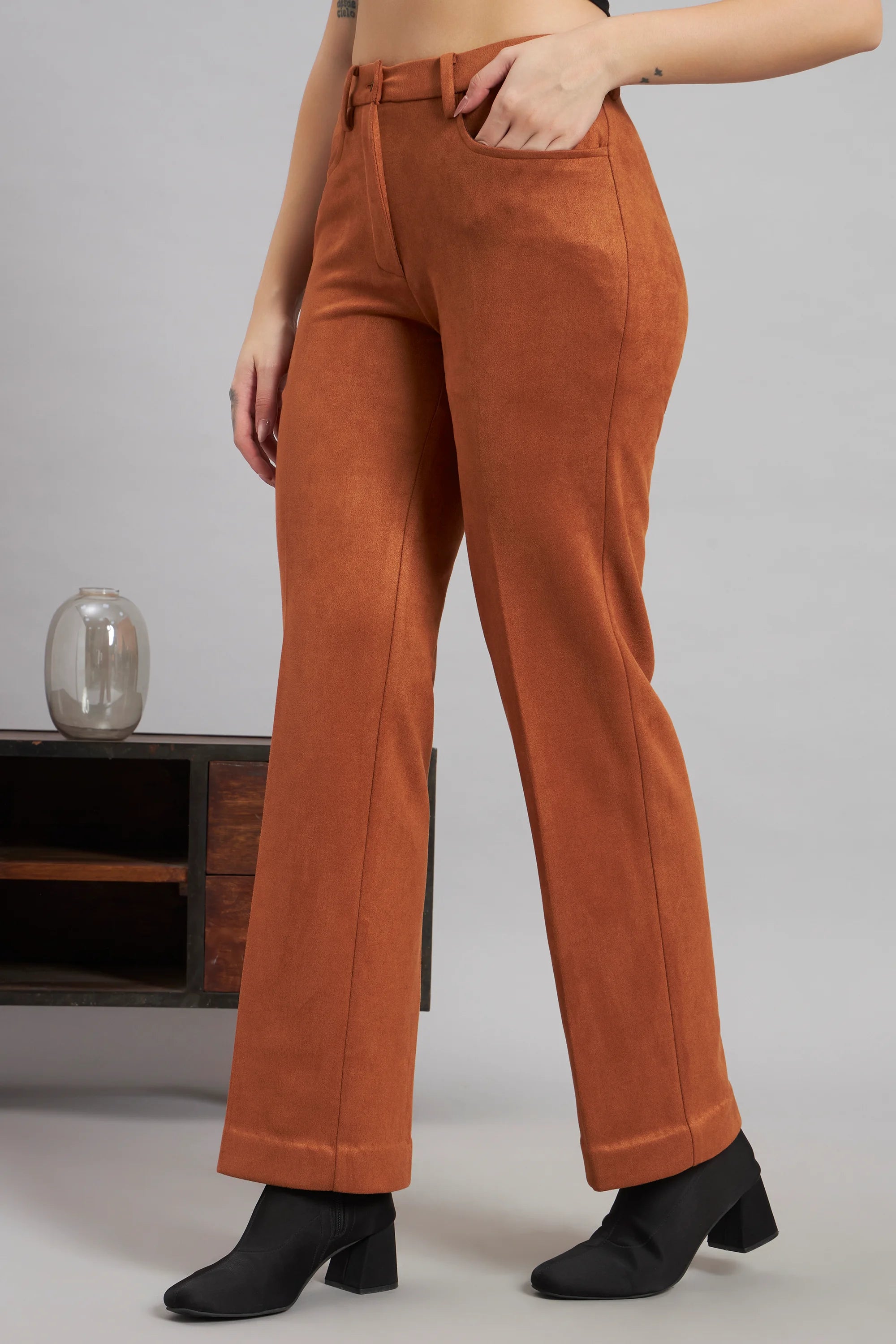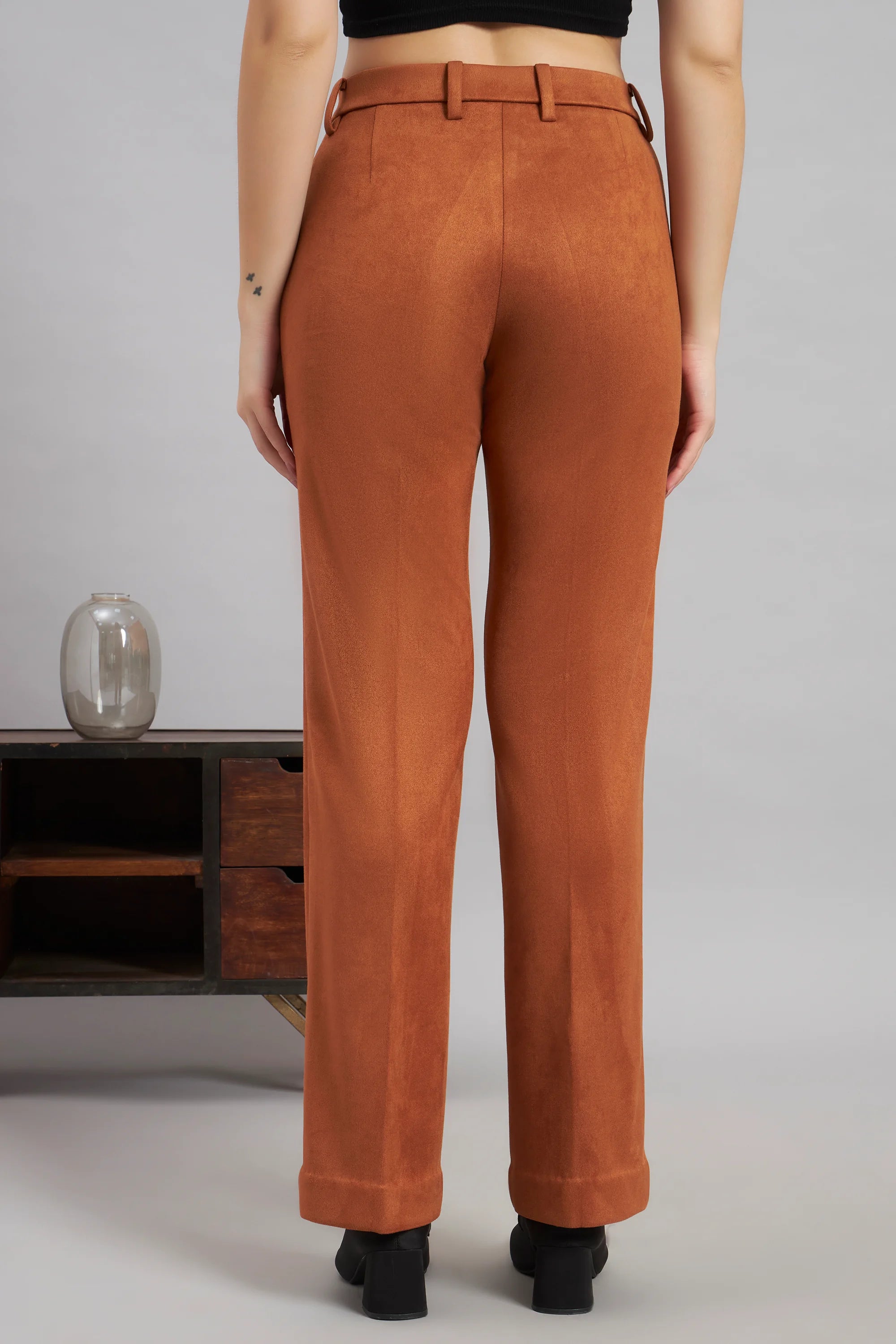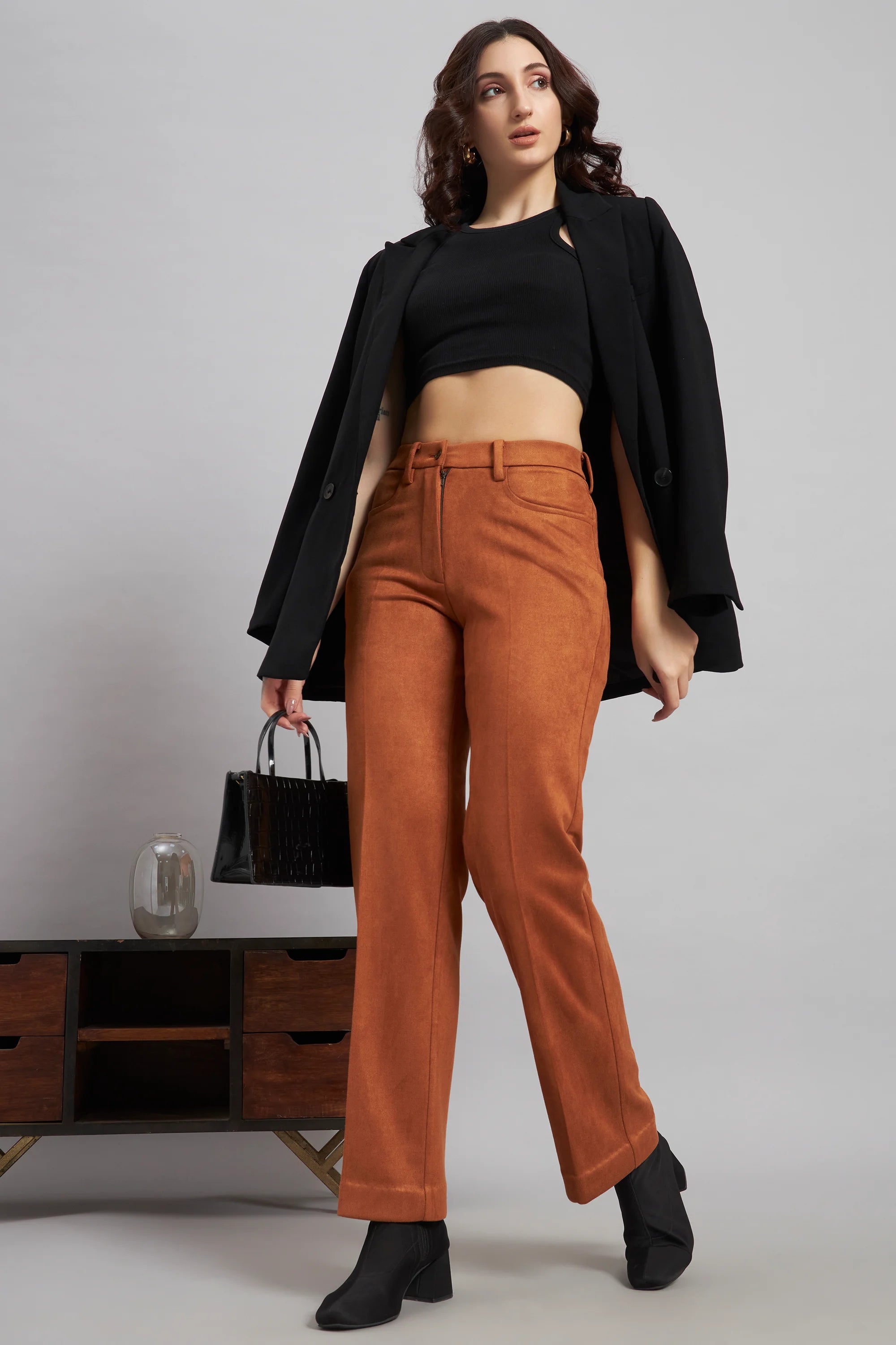 Step into winter sophistication with these luxe suede trousers, designed to make everyday dressing feel effortlessly refined. Crafted in a soft, stretchable mid-weight fabric, the high-rise, straight-fit silhouette flatters while keeping you comfortable all day. Thoughtful details like side pockets and a classic zip-button closure add practicality to polish. Available in timeless tan and brown, they’re winter essentials with attitude.